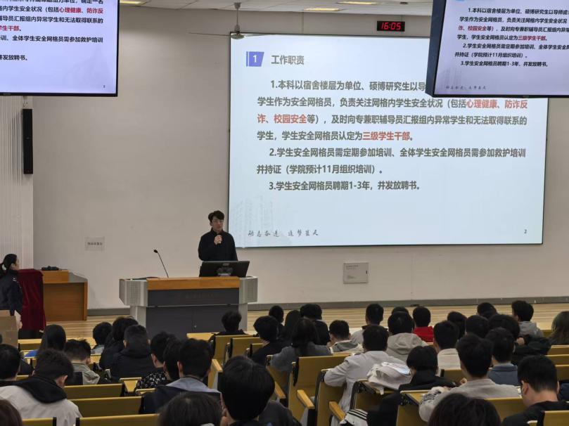 为进一步强化学生安全网格员的责任意识与业务能力,筑牢学院安全防控骨干支撑,近日,学院在明故宫校区13号楼报告厅开展学生安全网格员防诈反诈暨心理健康专题培训。