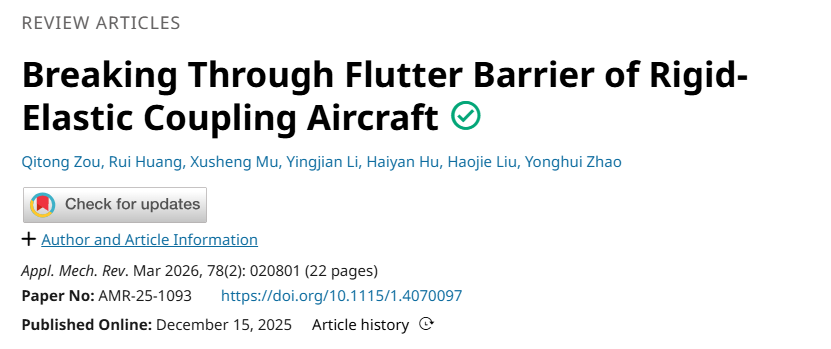 近日,由胡海岩院士、黄锐教授领导的团队在飞翼布局飞行器的刚-弹耦合颤振抑制技术研究方面取得突破。飞行试验表明,该团队成功实现结构强度极限内的刚-弹耦合颤振屏障突破,将安全飞行速度提高62.5%,创造了该领域的世界记录。相关研究成果以“Breaking Through Flutter Barrier of Rigid-Elastic Coupling Aircraft”为题发表于力学领域顶刊《ASME Applied Mechanics Reviews》(影响因子:16.1)。论文第一作者为我校威廉体育官方app下载博士生邹奇彤,通讯作者为威廉体育官方app下载黄锐教授和北京理工大学胡海岩院士,航空航天结构力学及控制全国重点实验室为论文第一完成单位。该研究工作获得国家自然科学基金委员会优秀青年科学基金、国家自然科学基金青年基金A类项目资助,是近20年来我国动力学与控制领域学者在该期刊发表的唯一论文。