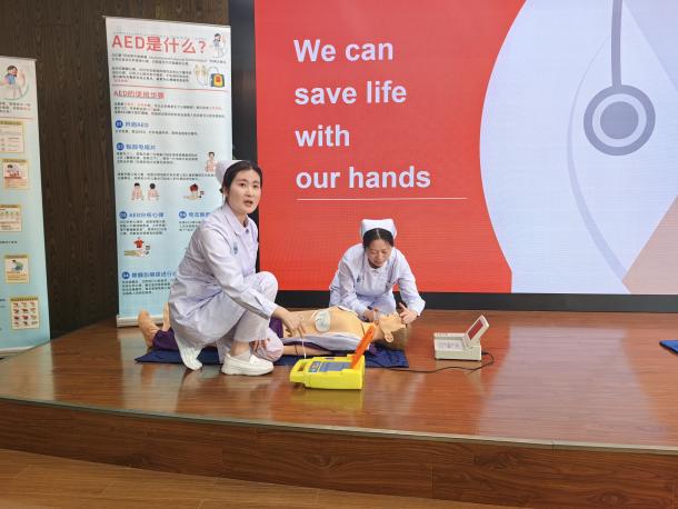 实操环节,医生团队利用人体模型分步骤演示胸外按压、人工呼吸等关键动作,手把手纠正按压位置、力度、频率等细节,现场学习氛围浓厚,参训人员热情高涨,纷纷上前学习体验。医生们耐心解答每一个疑问,及时纠正不规范动作,确保每位参训人员都能掌握正确的急救方法。